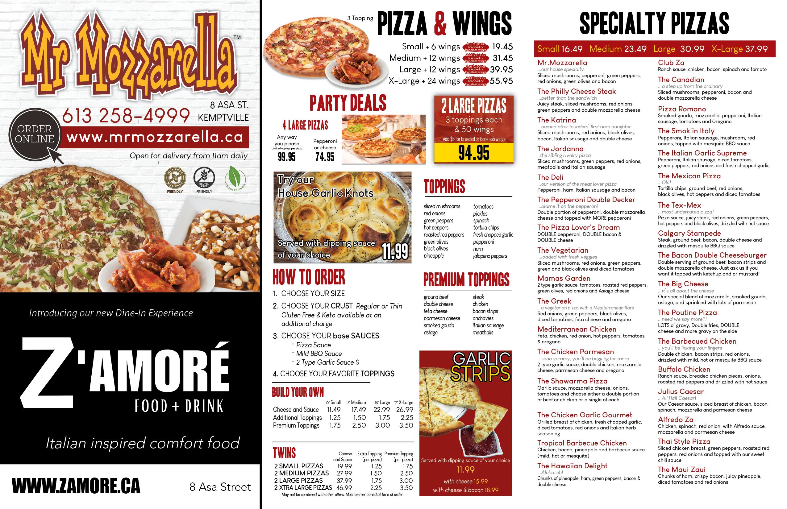Welcome to Mr. Mozzarella Kemptville, our home since 1997. We may be in a new building, but we are the OG of Kemptville. For 27 years, we have been making the best pizza, pasta, and finger foods for takeout & delivery. Our family recipe sauce, and crust are a staple in local homes and schools. We stand by quality & taste, and we never compromise on service. Kemptville, you will always hold a pizza our heart!